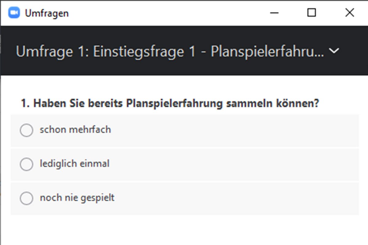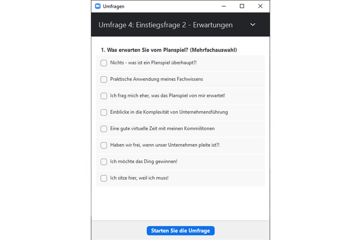 Nach der Begrüßung der Teilnehmenden mittels Video-Ansprache in Kombination mit der Umfrage-Funktion (vgl. Abbildungen) und Chat-Funktion von Zoom erfolgte eine kurze Planspieleinführung der Teilnehmenden über den geteilten Bildschirm. Danach starteten die Teilnehmenden zunächst in die Vorbereitung der Expertengruppen, um sich mit den Funktionsbereichen ihrer Unternehmen vertraut zu machen. Bei der Zuteilung in die sogenannten "Breakout-Sessions" half die vorbereitete und im Vorfeld der Veranstaltung versendete Einteilung der Teilnehmenden in Unternehmen und Experten, da sich somit unnötige Verzögerungen im Planspielverlauf vermeiden ließen. Auch die Bereitstellung des Teilnehmerhandbuchs im PDF-Format per E-Mail je zwei Tage zuvor hat sich hierbei bewährt. Die anschließende Präsentation der Expertengruppen lief ebenfalls reibungslos.