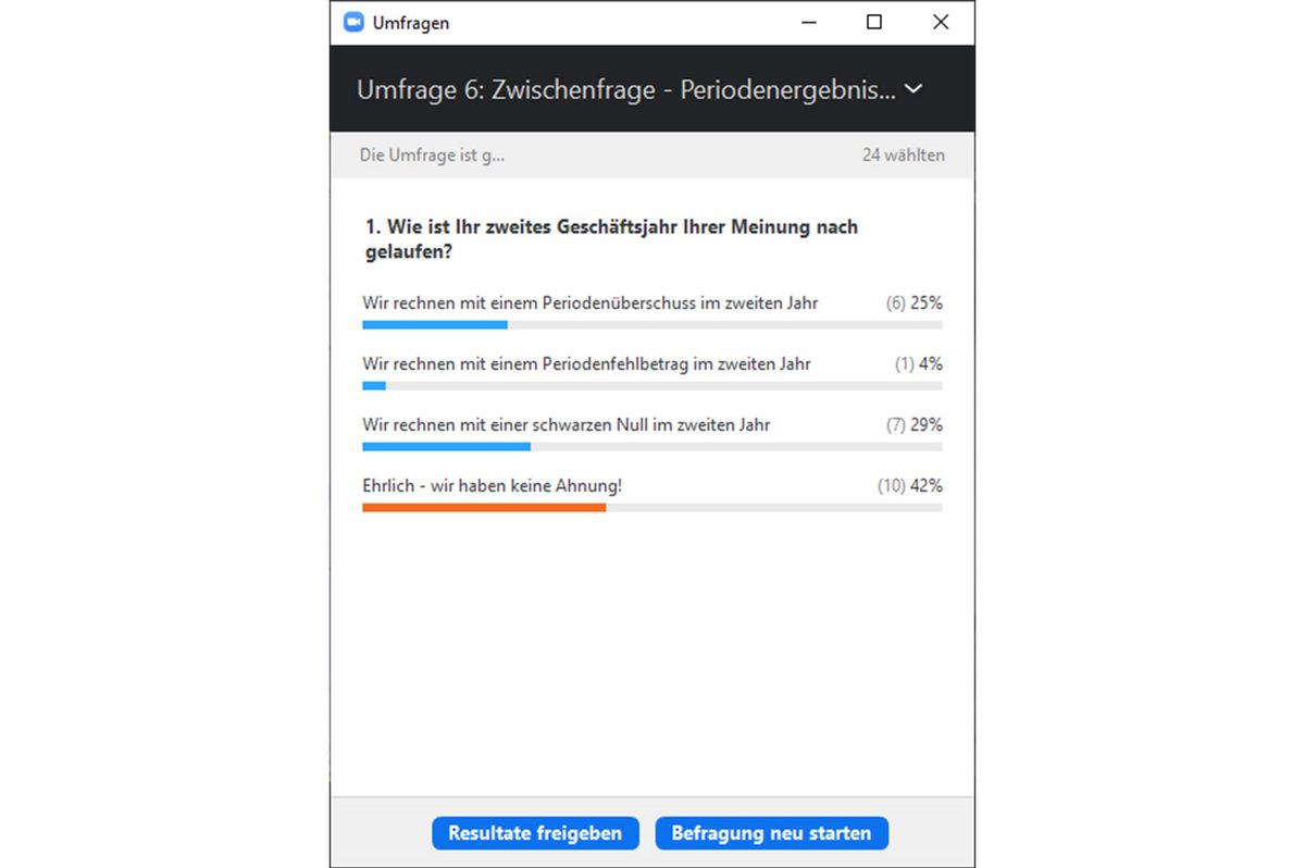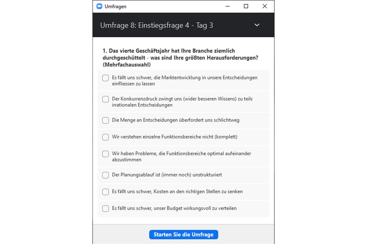 - Besonders bewährt hat sich unseres Erachtens das Einstreuen von Umfragen zur Begrüßung an jedem neuen Tag, zur Abfrage der geschäftsjahresspezifischen Herausforderungen der Teilnehmenden oder der Erwartungen der Teilnehmenden vor der Ergebnispräsentation.