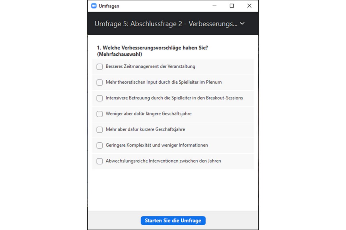 Die Feedbackrunden mit den Teilnehmenden starteten wir zur Auflockerung gelegentlich mit einer Umfrage, die man in Zoom (vgl. Abbildungen) vergleichsweise einfach und schnell anlegen kann. Bedauerlicherweise werden einmal erstellte Umfragen nicht unabhängig vom Meeting gespeichert und müssen daher mit jedem neuen Meeting (respektive Planspiel) neu angelegt werden. Für die eigentliche Ergebnispräsentation des jeweils gespielten Geschäftsjahres wechselten wir in den Compact View der TOPSIM-Cloud und teilten den Bildschirm über Zoom. In diesem Zusammenhang ist zu erwähnen, dass die TOPSIM-Cloud die individuelle und jederzeit anpassbare Konfiguration der sogenannten Compact View für alle Geschäftsjahre im Vorfeld eines Planspiels erlaubt oder aber eine spontane Zusammenstellung der grafischen Auswertungsmöglichkeiten genutzt werden kann.