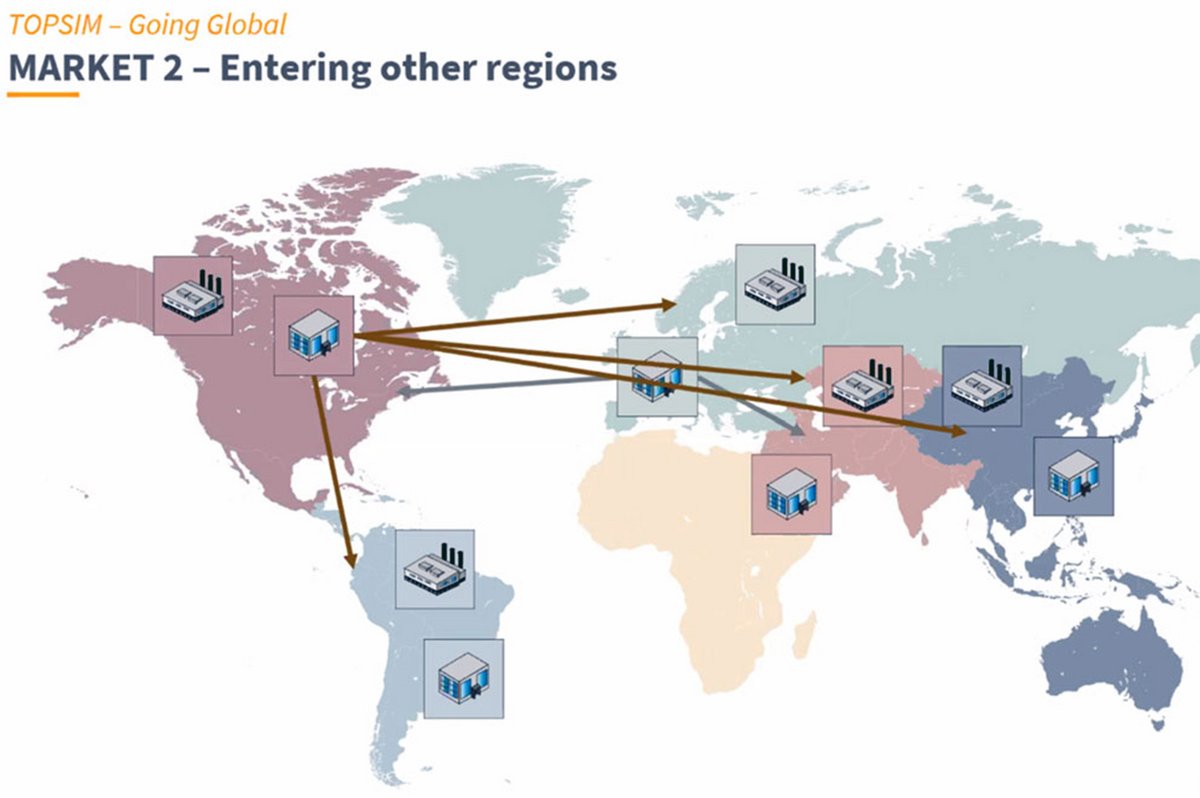 Doch dann wurde es ernst: Auf insgesamt drei Märkten mit je fünf Unternehmen lief das Online-Planspiel "TOPSIM Going Global". Jedes der fünf Unternehmen produziert und vertreibt Waschmaschinen und startet auf seinem Heimatmarkt (Europe, North America, South America, Asia I and II), um von dort aus international tätig zu werden. Dies kann über eigene Betriebsstätten oder Kooperationen mit ortsansässigen Unternehmen geschehen. Eine herausfordernde Aufgabe! Ein Team war mit Professor*innen und Mitarbeitenden der baskischen Hochschule besetzt – über ihre engagierte Mitarbeit als Team "Asia II" auf Markt 2 haben wir uns sehr gefreut! Betreut wurde jeder Markt von zwei erfahrenen Seminarleitenden, die ebenfalls einen hervorragenden Job machten.