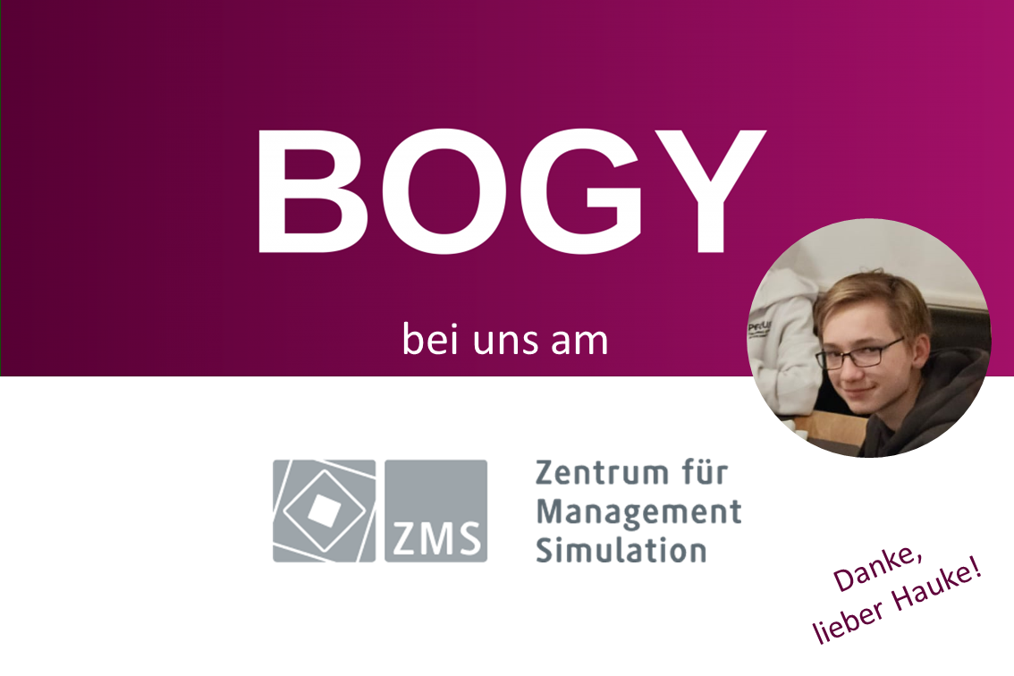 In der Woche vor den Osterferien war Hauke Schnelle als BOGY-Praktikant im ZMS. Er besucht die 9. Klasse des Hegel-Gymnasiums in Stuttgart und wollte einmal die Arbeit in einem Lehr- und Forschungszentrum einer Hochschule kennen lernen. Seine Aufgaben in dieser Woche waren vielfältig: Neben der Live-Erfahrung, was man in einem Planspiel so macht, sollte er unseren Materialraum beschriften und eine Übersicht darüber anlegen, die Räume in Ordnung bringen, Quizfragen eingeben und weitere kleine Aufgaben erledigen. Wir bedanken uns ganz herzlich bei Hauke für seine tatkräftige Unterstützung und wünschen ihm weiterhin viel Erfolg in der Schule und bei der Berufswahl!