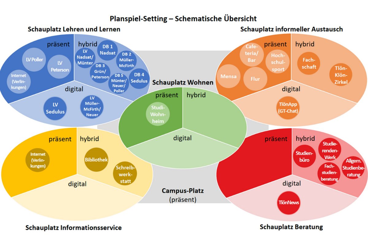 Schauplatz des Spiels ist das fiktive Suzette-Haden-Elgin-Institut für Fiktionale Sprachen, das auf dem Campus der gleichfalls fiktiven Nationaluniversität des Provinzstädtchens Tlön gelegen ist. Der Spielplan enthält fünf Schauplätze, auf denen sich die Akteure bewegen können: Räume für Lehren und Lernen, für informellen Austausch, für Beratung, für Information und Service sowie für Wohnen. Dabei werden die konkreten Orte innerhalb jedes Schauplatzes noch einmal nach "präsent/analog", "digital" und "hybrid" differenziert.