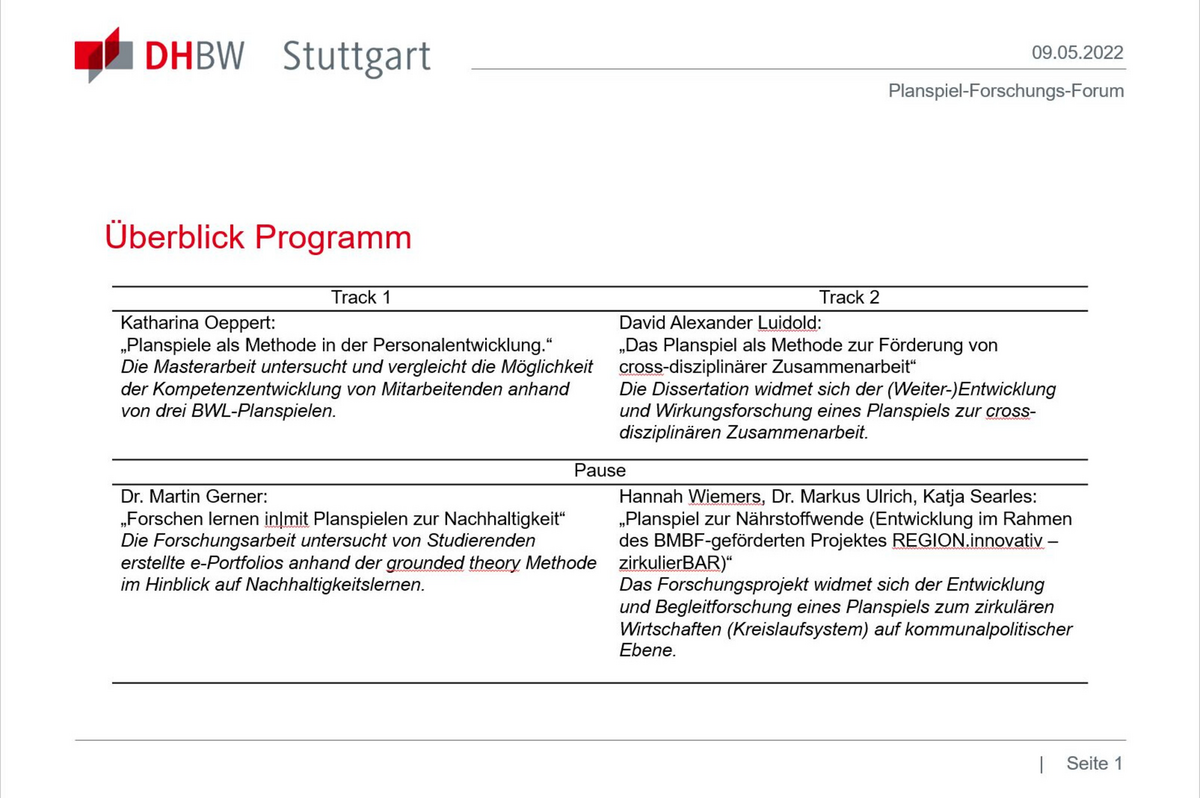 Zum zweiten Mal trafen sich am Freitag in einer virtuellen Session Planspiel- und Forschungsinteressierte zum Planspiel-Forschungs-Forum. Es wurden entstehende Forschungsarbeiten präsentiert und diskutiert. Katharina Oeppert geht in ihrer Masterarbeit der Frage nach, inwiefern Planspiele in der Personalentwicklung eingesetzt werden können. In seiner Dissertation beschäftigt sich David Luidold sowohl mit der Entwicklung als auch der Wirkungsforschung eines Planspiels zur cross-disziplinären Zusammenarbeit. Sowohl Martin Gerner als auch das Team Hannah Wiemers, Markus Ulrich und Katja Searles beschäftigen sich mit Planspielen und seinen Möglichkeiten zum Erlernen von Nachhaltigkeitskonzepten.